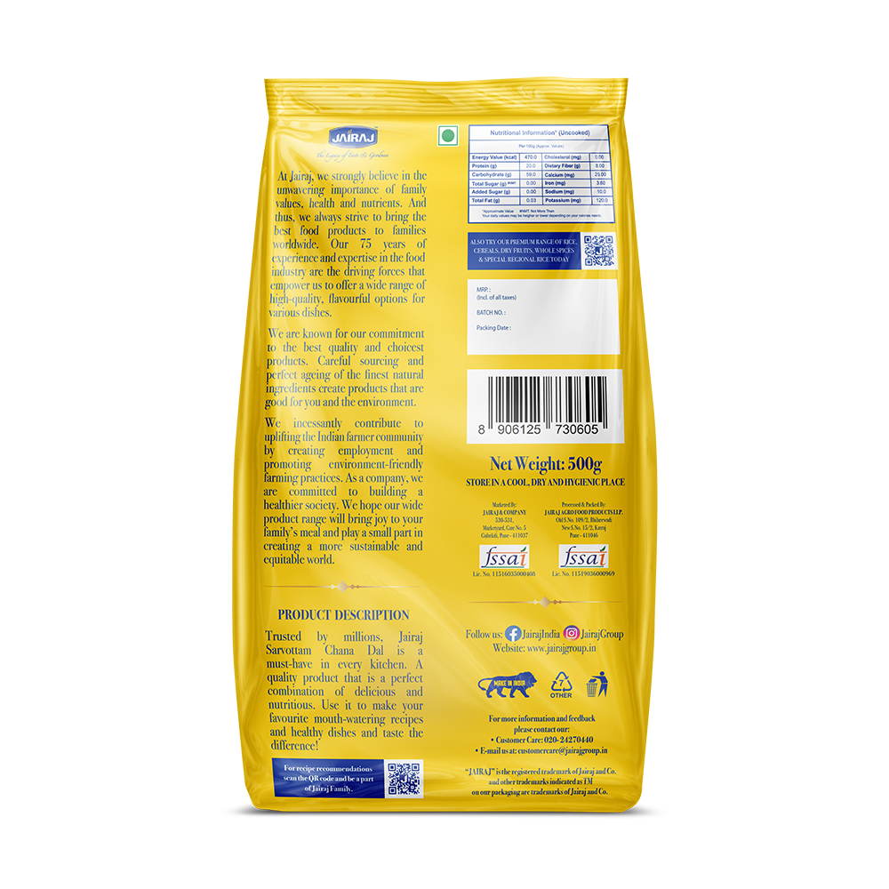 Trusted by millions, Jairaj Sarvottam Chana Dal is a must-have in every kitchen.  A quality product that is a perfect combination of delicious and nutritious.  Use it to make your favourite mouth-watering recipes and healthy dishes and taste the difference!