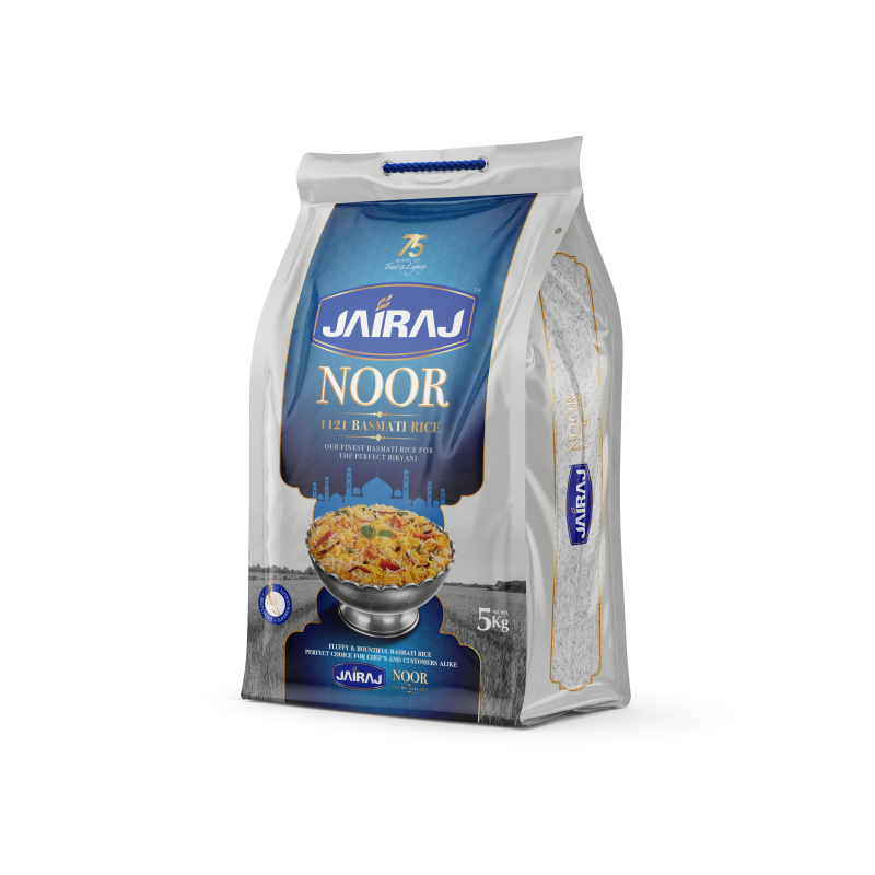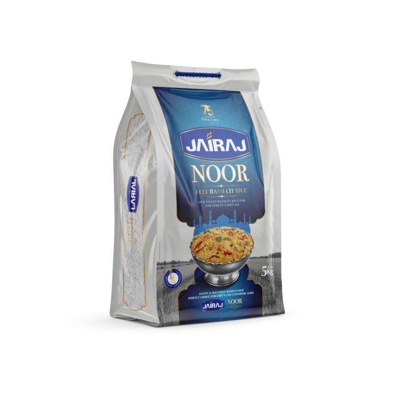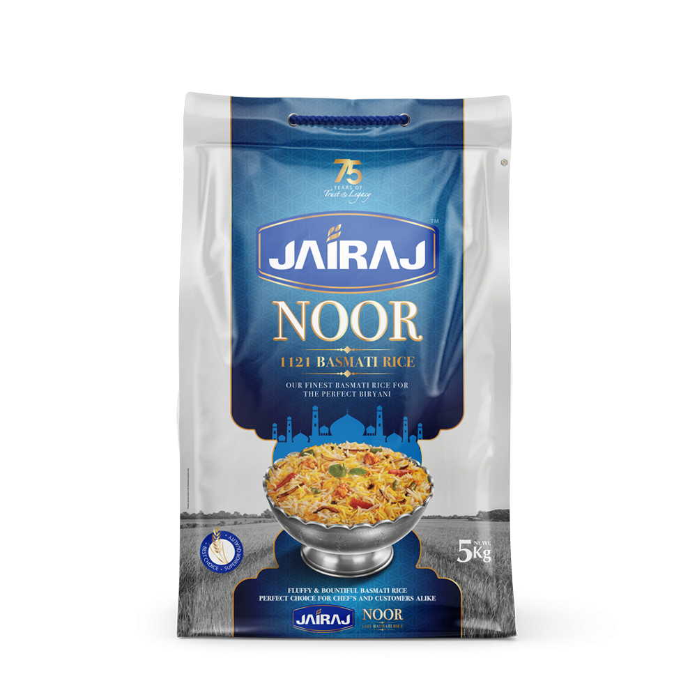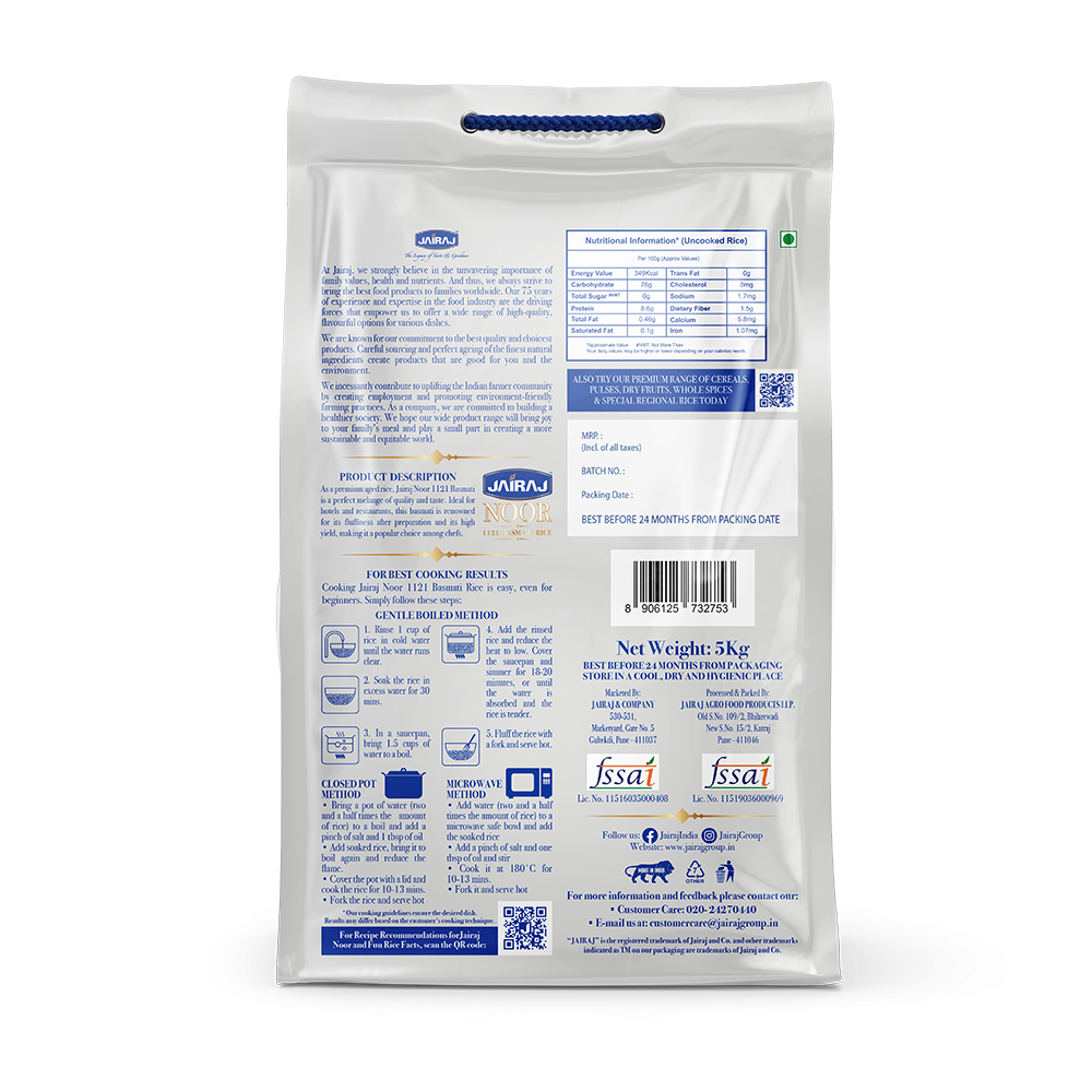 As a premium aged rice, Jairaj Noor 1121 basmati is a perfect melange of quality and taste. Ideal for hotels and restaurants, this basmati is renowned for its fluffiness after preparation and its high yield, making it a popular choice among chefs.