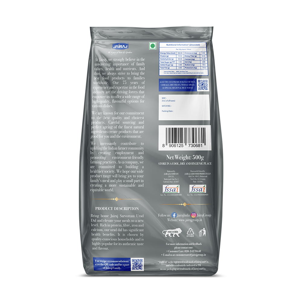 आमचीइडलीआणिडोसाजयराजच्याउडीदडाळीशिवायबनतचनाही. स्वच्छ, ताजीआणिचवदार. शिजवायलासोपीतरआहेचशिवायभरपूरप्रोटिन्सअसलेलीआणिपौष्टिक. आम्हीसगळ्याडाळीजयराजच्याचवापरतो, कारणआम्हीअनुभवलंय, जयराजम्हणजेबेस्टक्वालिटी!